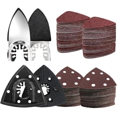 All-in-One Sanding Kit for Versatile Projects - Includes 2 triangle sanding pads (93mm), 2 fingertip sanding bases, 120 premium sanding sheets, and 3 universal adapters—everything you need for woodworking, furniture refinishing, or metal polishing. Ventilated Pads for Cleaner & Longer Use - Perforated triangle pads improve dust extraction and airflow, helping reduce clogging and overheating. Extends the life of your sanding sheets while keeping your workspace cleaner. Stronger Hook-and-Loop Grip - Upgraded adhesive system ensures sanding sheets lock firmly in place and resist detachment, even under heavy-duty use—ideal for continuous sanding and professional applications. Precision for Tight Corners & Detailed Finishes - Fingertip sanding pads allow access to hard-to-reach edges and corners, delivering smooth, fine finishes without damaging delicate surfaces. Perfect for detailed woodworking and DIY home projects. Wide Tool Compatibility - Designed to fit most oscillating multi-tools, including DeWalt, Makita, Ryobi, Milwaukee, Ridgid, and more. Supports both quick-change and traditional systems for easy setup.