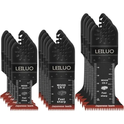 Unique Japanese teeth design enhances cutting speed and precision, easily handling various wood types and improving work efficiency. Made from durable CRV alloy steel with superior wear resistance compared to traditional HCS blades, extending blade life and reducing replacement costs. 15-piece multitool blades set includes 5 blades each of 34mm, 44mm, and 44mm extended blades, suitable for different cutting widths and depths. Quick-release universal interface compatible with major oscillating tool brands such as DeWalt, Makita, Dremel, Milwaukee, and Ryobi for fast and easy blade changes. Not compatible with Star.lock mounting oscillating tools such as Bosch, Fein, and Makita DTM52 models. Please verify your tool model before purchasing to avoid mismatches. Optimized cutting edge design reduces burrs and wood chips, significantly saving time and effort on post-cut sanding., Weight: 0.82011961464 pounds, Manufacturer: LEILUO