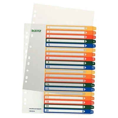 1-20 index for the clear organisation of A4 documents, Excellent for keeping track of important notes or paperwork, For home, school or office use Extra wide A4 Maxi format means the divider tabs will not be covered when used with punched pockets, Coloured tabs for clear classification of documents, Universal punched filing strip for easy filing in all types of binders and files Easy to update by hand or using the customisable table of contents templates at Leitz EasyPrint, Universal 11 hole filing strip Durable and tear-resistant wipe clean plastic surface, Ideal for use with Leitz Lever Arch Files and ring binders Contents: 1 x Leitz A4 Maxi PC Printable Index 1-20, Extra Wide, Plastic, Dimensions (WxHxD): 245 x 4 x 305 mm, Colour: White/Multi-Coloured, Weight: 271 g, 12960000
