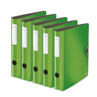 Versatile plastic folder in a pack of 5; A4 format for filing up to 350 sheets (80 g/m²), spine width 6.5 cm, for home, school, office or on the go Easy labelling of the self-adhesive label, individual design of the labels thanks to Leitz EasyPrint on the Leitz homepage, elastic band closure for safe transport of your documents Unique, patented 180° precision mechanism for 50% wider opening and 20% faster double-sided storage, 3 inner pockets for loose documents, business cards and pen Lightweight polyfoam (2.8 mm), round back with finger hole for easier carrying, made of robust, lightweight, water and dirt-repellent plastic, protects the furniture thanks to the non-scratching surface Box contents: 1 x Leitz quality folder, 180° active solid, A4, narrow, 2-hole punching, light green, dimensions (W x H x D): 65 x 318 x 312 mm, 10481050 Versatile plastic folder in A4 format for filing up to 350 sheets (80 g/m²), spine width 6.5 cm, for home, school, office or on the go