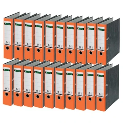 20 x quality folders with patented 180° precision mechanism for easier and faster filing. Holds 600 sheets (80gsm paper), ideal for home and office use Made from recycled cardboard and paper, Blue Angel and FSC certified Extra thick and sturdy recycled grey board covered with cloud marble paper (recycled) provides additional protection, spine label for identification of contents - additional labels can be individually created with Leitz EasyPrint on the Leitz website Durable A4 quality binder with finger hole, slots in the front cover and reinforced metal edge at the bottom for optimal stability Box contents: 20 x Leitz quality folders, orange spine, dimensions (W x H x D): 81 x 318 x 285 mm, 530 g, 10805045