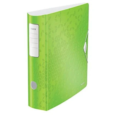 Multi-use lever arch file in green, 82 mm wide spine, holds 500 sheets (80 gsm paper), ideal for home, school or office use Easy labelling with EasyPrint custom label template available on the Leitz homepage, self adhesive spine label included W x H: 35 x 145 mm 50 Percent wider opening and 20 Percent quicker double sided filing thanks to patented 180 Degree lever arch mechanism, mechanism guaranteed for 5 years, rado slots to keep binder closed and upright on shelf Brighten up your desk with this and other products from the Leitz WOW range, lightweight polyfoam (2.8 mm), curved spine for easy carrying, three inner pockets for loose documents, business cards and pens, kind to furniture thanks to non-scratching surface Contents: 1 x Leitz lever arch file, green, WOW, dimensions: (W x H x D) 82 x 318 x 312 mm, 11060054