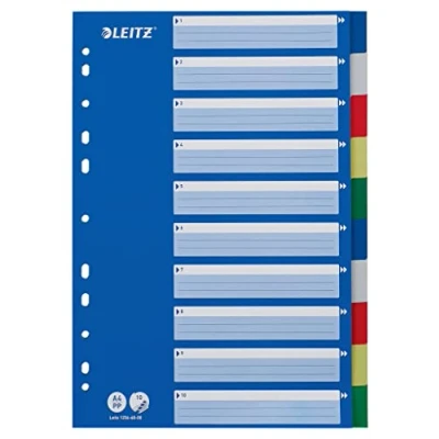 10-piece index for clear organisation of A4 documents, optimal overview of important notes or school documents, for home, school and office 10 tabs in different colours (blue, white, red, yellow, green) for organising documents, practical universal holes for filing in ring binders and folders Practical cover sheet with space to describe the various contents Robust and durable dividers made of polypropylene plastic and cover sheet made of 250 g/m² cardboard for optimal organisation for home and office Box contents: 1 x Leitz index for A4 folders, 1-10 plastic dividers and cardboard cover, dimensions (W x H x D): 22.5 x 29.7 x 0.1 cm, colour: multicoloured, 12566000