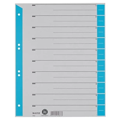 Coloured A4 dividers in blue Made from strong, durable cardboard 10 parts, numbered 1-10 with a multipunched binding strip for use with any binders Dimensions (WxH): 238 x 300 mm