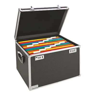 Suspension file storage chest, built-in rails preserve, protect, and store foolscap sized suspension files, ideal for museums, archives, homes and offices Holds up to 30 full foolscap suspension files or four foolscap lever arch files Double combination lock for improved security, easy to transport thanks to integrated carry handles, durable plastic coated wood box with aluminium reinforcements for added support Compatible with all foolscap Suspension files including the Leitz Ultimate Suspension File Contents: One Leitz Lockable Suspension Files Chest, Foolscap, 30 File Capacity, Dimensions (W x H x D): 36.5 x 34 x 42.5 cm, weight: 6.25 kg, materials: Plastic coated wood, aluminium reinforcements, colour: Black/chrome, 67150095