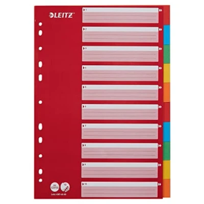 1-10 dividers for the clear organisation of A4 documents, helps in keeping track of important notes or school paperwork; for home, school or office use Coloured tabs for clear classification of documents; universal punched filing strip for easy filing in all types of binders and files Easy to update index by hand with large writing space Organize your home and office with this and other products from Leitz; durable and tear resistant 250 gsm recycled cardboard; Blue Angel certified Contents: One A4 Leitz 1-10 dividers, cardboard, 43876000, W x D x H: 22.5 x 0.3 x 29.7 cm; colour - red/multi-coloured; weight: 150 g