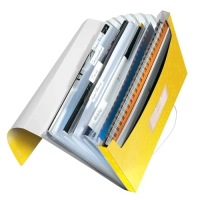 Yellow project file, 6 clear expanding compartments for holding loose documents and punched pockets, Holds up to 200 A4 sheets, Ideal for the transportation and organisation of documents, Perfect for meetings or school Front compartment perfect for storing loose items and note pads, Attractive elastic band for secure transportation Brighten up your desk when you mix and match with other products from the Leitz WOW range, Fits perfectly in Leitz box files and letter trays Durable and tear-resistant plastic Contents: 1x Leitz A4 Project File with 6 Expanding Compartments, Elastic Band Fastener, Yellow, WOW Range, 45890016