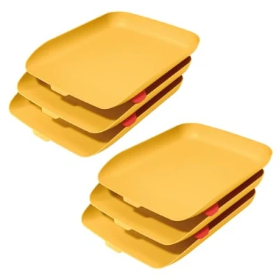 Pack of 6 letter trays in A4 format with matte surface, ideal for organising A4 documents, magazines and staplers, ergonomic design Ideal for organising documents and magazines, stylish stacking element in red accent colour for staggered stacking of up to three letter trays on top of each other Robust plastic material, easy access to the contents even when stacked thanks to wide opening Can be combined with other Leitz products from the Cosy range for home comfort and style with premium quality, ideal for a productive working environment Box contents: 6 x Leitz A4 letter tray, dimensions (W x H x D): 268 x 43 x 358 mm, colour: warm yellow, cosy assortment, cardboard packaging, 53580019