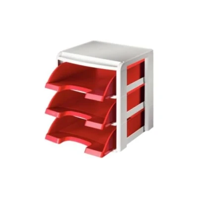 Letter tray rack with 3 Leitz Plus A4 red letter trays and a white rack with lid, Matte finish, Space saving design, For the organisation of A4 documents at your office or home Keep a clean desk with this and other products from the Leitz Plus range, Use alone or in combination with Leitz Plus standard, slim and jumbo letter trays for flexible storage solutions Can be stacked vertically and linked together to allow simple organisation of documents, magazines and folders, Connection clips available for flexible storage solutions, Rack allows you to remove the letter trays without effecting the overall stack Sturdy plastic material does not bend when full, Easy document access via large front opening, Non-slip protective rubber feet prevents surface scratches Contents: 1x Leitz A4 Letter Tray Rack, 3 x A4 Letter Trays, 1 x Lid, Dimensions (WxHxD): 31.5 x 28.5 x 35.5 cm, Colour: Red, Plus Range, 53270025