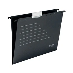 This premium quality suspension file, with 15mm v-base, is ideal for maximising storage space with vertical filing, It holds 150 punched A4 sheets (80gsm) and can be extended to fit 300 sheets Hanging suspension files are made from 100% recyclable 250gsm card, The label holder included makes file organisation and identification easy, Comes in a modern and stylish black colour with light grey print The strong "S" shaped metal bars won't bend the folder under weight, A special paint coating applied to the metal bars reduces noise when sliding the files, The closed sides enable secure storage of documents Mix and Match with other eco friendly stationery products from the Leitz Recycle range, and Blue Angel certified Contents: 1 x Leitz Recycle Alpha Card Suspension File, Dimensions (H x W): 348 x 270mm, Black/Grey, 19210095