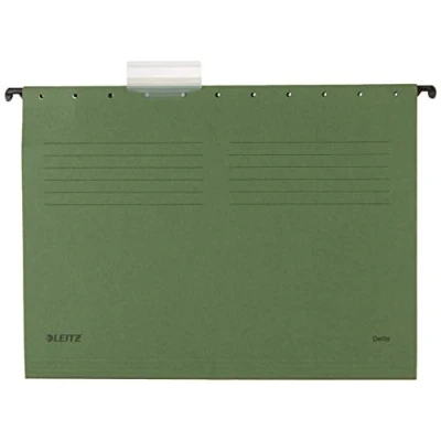 Leitz folder suspended, ideal for storing loose sheets A4 in an orderly way, perfect for use in your home or office Adapts perfectly to the drawers, equipped with portacartellino repositionable for easy identification of contents Tear resistant and durable to wear thanks to the material folder, jam-free Plastic Hangers with Metal reinforcement for a smooth ride Repositionable Label Holder with exchangable labels on bar for easy identification of contents of the folder, 100% recycled card (250 g/m²), 33 cm spacing Package Content: 1 Leitz Suspension File Delta, Dimensions (W x H): 25.4 x 34.8 cm, ririclato card, Green Metal Bars, 65150055