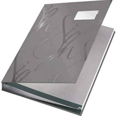 Grey signature book with 18 rigid card dividers, for organising and safely storing important documents like contracts and bills for home or office use Sturdy hard cover with smooth coating protects documents from damage, 18 dividers with grip surface keep papers in place, replaceable label on cover for quick and easy identification of content Easy to turn pages without tearing thanks to tabs on bottom of dividers, waterproof cover, recycled card material protects signatures from smearing High quality durable dividers, 90 percent of product is made from 100 percent recycled material Contents: One Leitz Signature Book with 18 Card Dividers, A4, dimensions (W x H x D): 24 x 2.8 x 34 cm, material(s): Hardboard cover, colour: Grey, 57450085
