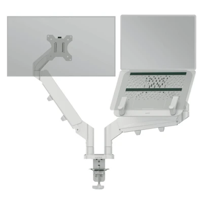 SPACE-SAVING DESIGN: Mounts in small spaces while still providing optimal visual ergonomics. Cable management system helps keep your workspace organised; Suitable for home offices, study areas, and compact workstations ADJUSTMENT: Dual spring-assisted arms support a 17"-32" monitor (up to 9kg each arm) and a 13-17" laptop (up to 2.4cm thick). Features +90°/-90° swivel, 180° rotation, and +55°/-55° tilt and 185-435mm height adjustment, with just one hand EASY TO INSTALL: The quick release detachable Vesa plate (75 and 100mm), and silicon rubbered c-clamp will reduce vibration and protect the desk surface or by grommet hole (desktop thickness range: 10–80mm) ADJUST FOR COMFORT: The single monitor arm can improve posture, eye alignment and neck and shoulder comfort when the height of the monitor is adjusted correctly; Monitor and laptop can be adjusted independently of each other CERTIFICATIONS: Tested and recommended by the German IGR Institute for Health and Ergonomics (monitor arm only), according to DIN 26800 EN ISO 15537 and TÜV certified CONTENTS: 1 x Leitz Ergo Space Saving Dual Monitor & Laptop Arm. Includes all necessary tools for adjustment and assembly, light grey, 65380085