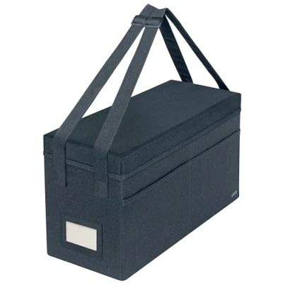 STORAGE CAPACITY & CARRY HANDLE: Holds a 16'' laptop, full size keyboard, mouse, cables, headset, notebook, water bottle, and other daily essentials (up to 8kg). Two adjustable handles (15-45 cm) for hand or shoulder carry PRACTICAL DESIGN: Includes 3 compartments, a central laptop section, two elastic pen holders, and six accessory slots. The bags are stackable, allowing you to stack up to three and is fully collapsible for optimal space-saving SECURE & COMPACT: The removable lid shields contents from dust and spills, while maintaining privacy and confidentiality of documents inside; Fits in lockers or cabinets with minimum dimensions of 48cm x 21cm and a height of 27cm SUSTAINABLE & DURABLE: Product can be fully dismantled, made from 57% recycled soft material and is 98% recycable, reinforced with recycled cardboard for strength and durability ALWAYS WITH YOU: Features a matte grey velvet finish – suitable for staying organised in the office, at home, for hybrid work, or at school. Also useful as a teacher’s bag, craft supply organiser, stationery caddy, or a art and project bag CONTENTS: 1 x Leitz Fabric Hot Desking Work Bag with lid and a name tag to easily identify the bag in shared office spaces, velvet grey, 67230089