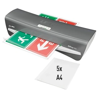 Reliable Protection Modern Leitz Laminator A4 with compact design for airtight, waterproof protection of documents, photos, instructions, menus, drawings, plant samples, signs High laminating speed: 45 seconds for an A4 film (80 micron); suitable for 80 (75) to 125 mic laminating pouches; lamination of objects up to 0.4 mm thick High speed preheating: 1 minute warm-up time, ideal for laminating small runs; ideal for use in the office or school for perfect results Easy to use: laminating machine with on/off switch, automatic feeding, 45 seconds laminating process, LED readiness indicator and audio signal to start Box contents: 1 x Leitz Office DIN A4 laminator with laminating pouches starter kit (80 microns) iLAM, dimensions: 128 x 76 x 370 mm, weight: 1.3 kg, silver/white, 72510084