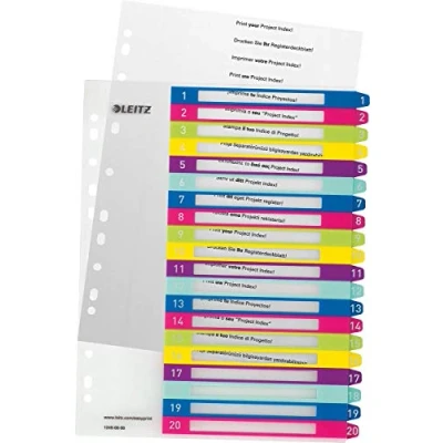 Leitz Index for A4, Pack of 6, PC writable Cover Sheet and 20 dividers, tabs with Number Print 1 20, Extra Width, Multicoloured, Polypropylene, Wow, 12450000