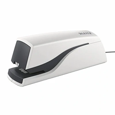 Stylish and powerful electric stapler for stapling up to 10 sheets of paper, Easy one hand operation Uses Leitz e1 for jam free performance every time, Comes with 200 staples Plugs into the mains for non stop use (adaptor supplied), Fits neatly on your desk, Use at home or in the office Covered by a 3 year guarantee, GS safety tested Contents: 1 x Electric Stapler, adaptor and 1,000 e1 staples, White, (WxDxH) 44 x 64 x 153cm, Weight 0.23kg, 55321001