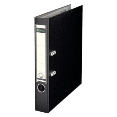 High quality lever arch file for professional office users, Wipe clean plastic cover in black, 50mm spine, holds up to 350 (80gsm) sheets, For frequent home, school or office use Highly resistant cover made from 30 percent pre-consumer recycled PP foil and PE laminated paper on the inside on sturdy 90 percent post consumer recycled board for extended durability 50 percent wider opening and 20 percent quicker double sided filing thanks to patented 180 degree lever arch mechanism; Mechanism guaranteed for 5 years, rado slots keep binder closed and upright on shelf Pocket on spine allows you to quickly exchange label for easier personalisation, EasyPrint custom label template available on the Leitz homepage Contents: 1 x Leitz Plastic Lever Arch File, Black, 10151085, Dimensions (W x H x D): 55 x 318 x 285 mm, A4, For two hole items