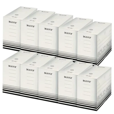 The Leitz solid box archive boxes are perfect for archiving and storing A4 documents to create order in your office or home. Each storage box holds up to 1400 sheets The double locking tabs prevent unwanted opening of the box and also reinforce the grip hole. The boxes allow for particularly effective storage of documents in A4 format With a spine width of 150 mm and the height and depth of an A4 document, the storage box fits most shelves and can be stored vertically or horizontally. Ideal for archives Easy to assemble with the printed instructions (English language not guaranteed). The archive boxes are equipped with labels on the side and front for quick identification. With finger hole for easy removal Box contents: 10 x Leitz archive boxes A4 with 80 mm spine width, dimensions (W x H x D): 150 x 257 x 330 mm, weight: 220 g, white/black, 61290001