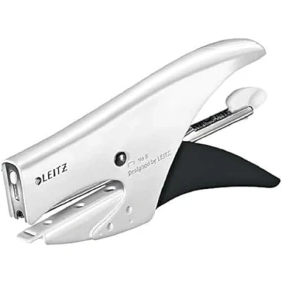 Stapling pliers for up to 15 sheets (80 gsm paper for home, school and occasional office use, uses N°8 staples Staples: N°8 staples fastens up to 15 sheets of 80 gsm paper, also works with Leitz white staples which are invisible when photocopied Space-saving: Fits on every desk and most drawers thanks to its compact size, paper insertion depth 49.5 mm Brighten up your desk with this and other products from the Leitz Wow range, 10 years guarantee, ergonomic handle for comfortable use, back loading makes it easy to refill Contents: 1 x Leitz stapling pliers Wow range, White, blister packaging, 55472001, dimensions (W x H x D) 24 x 82 x 160 mm, Weight: 290 g, includes: Staples N°8