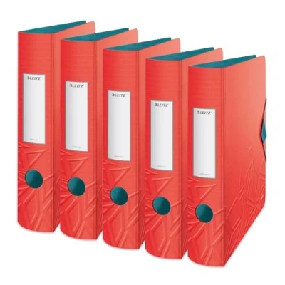 5 x versatile plastic folders in A4 format for filing up to 350 sheets (80 g/m²), spine width 6.5 cm, for home, school, office or on the go Easy labelling of the self-adhesive label, individual design of the labels thanks to Leitz EasyPrint on the Leitz homepage, elastic band closure for safe transport of your documents Unique, patented 180° precision mechanism for 50% wider opening and 20% faster double-sided storage, pen tab inside and inner pocket for loose documents Lightweight polyfoam, round back with finger hole for easier carrying, made of robust, lightweight, water and dirt-repellent plastic, protects the furniture thanks to the non-scratching surface Box contents: 5 x Leitz quality folders 180° Active Urban Chic, A4 format, 2-hole punching, colour: red duo look, dimensions (W x H x D): 65 x 318 x 308 mm, 11170020