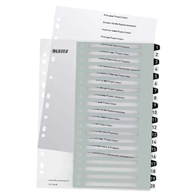 Striking and stylish printable index with premium 1-20 numerical tabs, Strong and durable with heavy duty 0.30mm PP Reusable and extra durable with vibrant colour-coding for easy sorting and organization A4 Maxi format for quick and convenient access of documents even when used with pockets, 11-hole universal fit Customisable table of contents with smart and exclusive designs available on leitz website for convenient and personalised organisation Contents: 1x Leitz WOW Printable Index, 1-20, A4, 12170000, Black/White