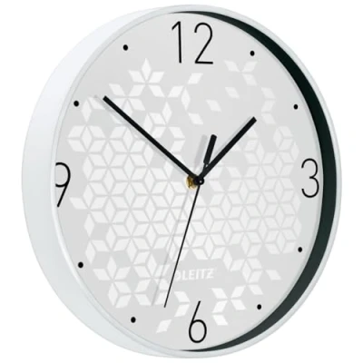 Stylish Wall Clock featuring a coloured frame and geometric pattern ideal for adding a touch of modern design to any home or office Clear glass face and big numbers ideal for stylish and visible display around the house and office, Includes mounting hole for easy hanging, Requires 1 x AA battery (not included) Features silent quartz movement for minimal distraction in any home or work environment Available in a range of attractive WOW colours with unique eye-catching geometric pattern to brighten up your home or office space Contents: 1x Leitz WOW Quartz Wall Clock, White, 90150001, Dimensions: 29 cm, Weight: 650 g