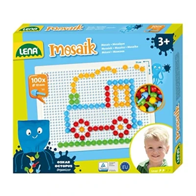 Lena Mosaic colour is a colourful plug-in game for children, with which wonderful motifs can be re-inserted according to their own ideas. There are no limits to your imagination Mosaic plug-in game with 100 plugs with a diameter of approx. 10 mm, which are available in the 4 colours blue, green, yellow and red as well as a white pegboard with the dimensions L/W of 21 x 16 cm For the first attempts, there are plug-in templates with great mosaic motifs on the back of the pack, so that children from 3 years can get started enthusiastically. Set with storage bag Sticking mosaic pictures is a neat challenge for children. This meaningful activity promotes creativity, patience and dexterity and brings huge craft fun The mosaic set is made in the EU and is TÜV tested, ideal as a gift idea and souvenir, dimensions: approx. 24 x 21 x 3 cm. Weight: approx. 165 g, item no. : 35623, EAN: 4006942854103, Manufacturer: SiMM Spielwaren GmbH