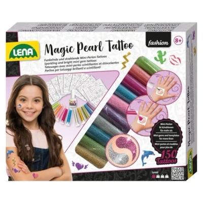 Lena Magic children's tattoo set with shimmering mini beads in 10 colours, 200 stencils in 40 shapes and body glue for girls from 6 year of age, who will enjoy being pretty Easy to use: select the stencil, apply glue with the brush tip and spread mini beads in the desired colour. The creative set is made of completely harmless material for children Thanks to the many motifs and shapes, taffe girls can let their creativity and imagination run wild and also practice artistic design with lots of fun The colourful pearl tattoo set is wonderful as a gift idea for children's birthdays, Easter, Santa Claus, certificate or as a souvenir and comfort plaster for fashion-conscious girls Package dimensions: approx. 24 x 5 x 20 cm. Weight: approx. 390 g, pieces: 211, motif: tattoo pearls, colour: multicoloured, age: from 6 years, item number: 42442, EAN: 4006942849109, brand: LENA, Manufacturer: SiMM Spielwaren GmbH