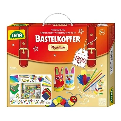 LENA Premium craft supply case with a huge selection of 1300 accessories for creative crafts and designing individual artwork and a variety of crafts With 30 different high-quality craft materials, such as transparent film and paper, colourful corrugated cardboard, felt, fleece, self-adhesive rhinestones, foam rubber parts, wooden sticks, feathers and buttons The practical storage case is equipped with large compartments for neatly sorted and always at hand craft material. So you can quickly clean up even on the go with friends Suitable as a gift and souvenir, for activity at children's birthdays or for driving away long periods on rainy days for children aged 5 and up, whether girls, boys or big craft fans Crafting with the craft set suitcase promotes children's creativity, concentration, dexterity and patience, brings lots of fun and makes mighty pride in the finished result, Manufacturer: SiMM Spielwaren GmbH