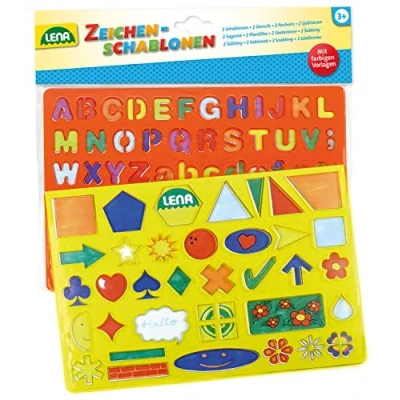 Lena 65774 Drawing Stencil Set Alphabet, Numbers and Signs, with Colour Samples 2 Stencils Letters, Numbers, Arithmetic Operators Shapes, 26x19 cm, for Children from The Age of 3