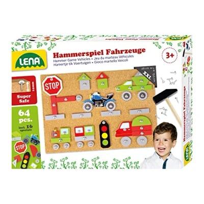 LENA Hammer game vehicles with 64 different parts with cork plate for designing colourful traffic motifs for children from 36 months of age The set includes a small hammer, nails, a cork board measuring 28 x 19.5 x 1.4 cm and colourful plates for hammering and varying Hammer games are wonderful for your little one to promote creative play and train motor skills Please note, due to small parts that can be swallowed and functional sharp tips, the set is not suitable for children under 36 months Package dimensions: approx. 33 x 4.5 x 24 cm. Weight: approx. 0.46 kg; Parts: 64; Motif: vehicles; colour; multi-coloured; Age: from 36 m+; Item number: 65826; EAN: 4006942871506; Brand: LENA, Manufacturer: LENA