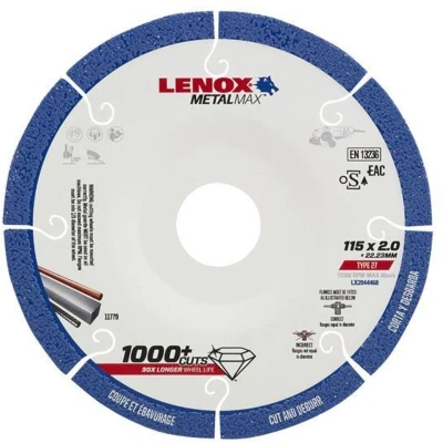 General description The LENOX METALMAX™ Diamond Blade is engineered for exceptional durability and efficient cutting performance. It generates less dust and odor compared to traditional bonded abrasives, with visible sparks originating solely from the material being cut. The solid steel body significantly minimizes the risk of breakage, while the additional layer of brazed diamonds on the top and bottom edges enhances its capability to cut, grind, and deburr light materials effectively. Technical specifications Diameter: 115 mm Thickness: 2.0 mm Bore size: 22.23 mm Compatibility and accessories Compatible with angle grinders and cutting tools designed for diamond blades Installation Ensure the tool is unplugged before installation Attach the blade securely to the tool's arbor Follow the manufacturer's instructions for proper mounting Usage Use for cutting metal, light grinding, and deburring tasks Operate at recommended speeds to prevent damage Wear appropriate safety gear during