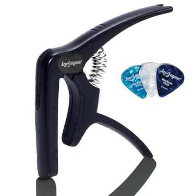 Premium Craftsmanship: The Leo Jaymz capo is designed for acoustic, electric guitars, as well as ukuleles, bass guitars, banjos, and mandolins. Sleek Zinc Alloy Design: Crafted from silver-plated zinc alloy. It perfectly balances style and function, offering both a chic appearance and an effortless playing experience. Precision Tension for Clear Sound: Built with an industrial-strength spring, this capo ensures precise tension on the strings, eliminating fret buzz and delivering crystal-clear sound for impeccable performances. Multi-Functionality (3-in-1): This versatile accessory combines three essential tools in one: a capo, pick holder, and string puller, covering all your needs during performances and practice sessions. String Protection: The silicone strip pads are designed with the ideal hardness, ensuring they won't damage your strings. Additionally, the materials are free from any chemical reactions that could harm your instrument. Ideal for All Musicians: Whether you're a seasoned player or just starting, this capo is perfect for a wide variety of stringed instruments, catering to musicians of all skill levels and styles.