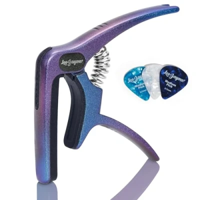 Premium Craftsmanship: The Leo Jaymz capo is designed for acoustic, electric guitars, as well as ukuleles, bass guitars, banjos, and mandolins. Sleek Zinc Alloy Design: Crafted from silver-plated zinc alloy. It perfectly balances style and function, offering both a chic appearance and an effortless playing experience. Precision Tension for Clear Sound: Built with an industrial-strength spring, this capo ensures precise tension on the strings, eliminating fret buzz and delivering crystal-clear sound for impeccable performances. Multi-Functionality (3-in-1): This versatile accessory combines three essential tools in one: a capo, pick holder, and string puller, covering all your needs during performances and practice sessions. String Protection: The silicone strip pads are designed with the ideal hardness, ensuring they won't damage your strings. Additionally, the materials are free from any chemical reactions that could harm your instrument. Ideal for All Musicians: Whether you're a seasoned player or just starting, this capo is perfect for a wide variety of stringed instruments, catering to musicians of all skill levels and styles.