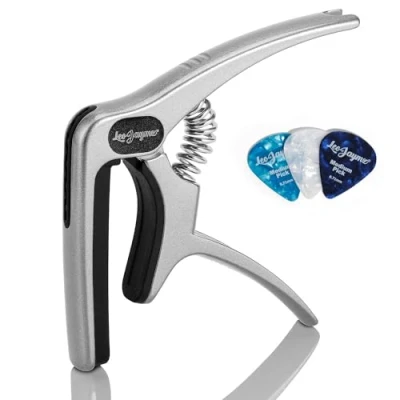 Premium Craftsmanship: The Leo Jaymz capo is designed for acoustic, electric guitars, as well as ukuleles, bass guitars, banjos, and mandolins. Sleek Zinc Alloy Design: Crafted from silver-plated zinc alloy. It perfectly balances style and function, offering both a chic appearance and an effortless playing experience. Precision Tension for Clear Sound: Built with an industrial-strength spring, this capo ensures precise tension on the strings, eliminating fret buzz and delivering crystal-clear sound for impeccable performances. Multi-Functionality (3-in-1): This versatile accessory combines three essential tools in one: a capo, pick holder, and string puller, covering all your needs during performances and practice sessions. String Protection: The silicone strip pads are designed with the ideal hardness, ensuring they won't damage your strings. Additionally, the materials are free from any chemical reactions that could harm your instrument. Ideal for All Musicians: Whether you're a seasoned player or just starting, this capo is perfect for a wide variety of stringed instruments, catering to musicians of all skill levels and styles.