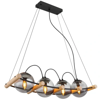 This pendant lamp of the LEONA series has a metal frame in matt black, wood details in natural colors and a smoke-colored glass shade. The cable is made of black PVC and the height of the pendant lamp is adjustable. The dimensions are LxWxH: 750x220x1200mm and 4 E27 15W 230V bulbs are required, which are not included in the scope of delivery. Product features: Pendant lamp metal black matt, wood natural color, glass smoke colored, cable pvc black, adjustable height, lxwxh: 750x220x1200mm, excl. 4x e27 15w 230v