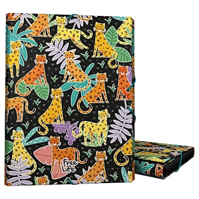 School folder with three flaps. Folio format. Elastic band closure. Made of cardboard with FSC certified paper, soft laminated, soft to the touch. Free Life Leopard Stationery Collection