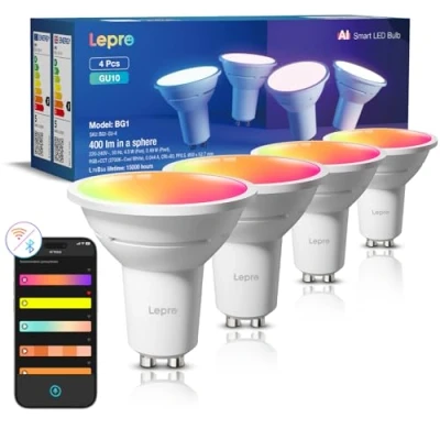 Lepro LightGPM 4 - Personalized AI Lighting Designer: No more generic lighting! Just tell LightGPM 4 what you love, and it never forgets your favorite colors and effects. The more you use it, the more the lighting design suits your preferences, make it your personalized AI lighting designer! (Note: Requires downloading the Lepro app and does not come with a remote controller.) Upgraded Voice Control - Easy to Use: No manual setup or preset scrolling, just tell the Lepro app what you want: ignite holiday vibes, elevate parties, or mirror your favorite movie and game themes and get perfect lighting in seconds. 400LM High Brightness & RGBCCT: Lepro GU10 smart LED bulb delivers 400 lumens of bright, clear illumination with seamless 1%-100% dimming. Easily switch between tunable white light (2700K-5700K) and 16 million RGB colours through the app. (Not compatible with physical dimmer switch.) Take a Photo, Get the Vibe: Not sure how to describe the lighting design you want? LightGPM recognizes images. Snap a picture of your room for a lighting design that's perfect for the space, or upload a favorite movie poster or game character to instantly theme your space. Hands-Free Voice Control: The smart spotlight bulb can easily and quickly connect to Alexa and Google Assistant to provide effortless hands-free voice control. Note: Before connecting to Alexa or Google Assistant, please make sure the bulb is connected to 2.4 GHz WiFi through the Lepro APP. Timers & Schedules: Automate your lighting with preset on/off times or create personalized scenes. The Lepro GU10 bulbs also feature wake-up and sleep modes that mimic sunrise and sunset to support a natural sleep cycle. Sync with Music: With LightBeats algorithms, the dynamic lighting of the BG1 color changing light bulb can intelligently sync seamlessly with the music rhythms. Transform any space into an energetic and mesmerizing musical journey, perfect for parties or dancing with friends. Energy Efficient & Long-Lasting: These 4.5W GU10 smart LED bulbs replace 50W traditional bulbs, saving up to 91% on electricity. With a lifespan of over 15,000 hours, they last 10 times longer than traditional bulbs.