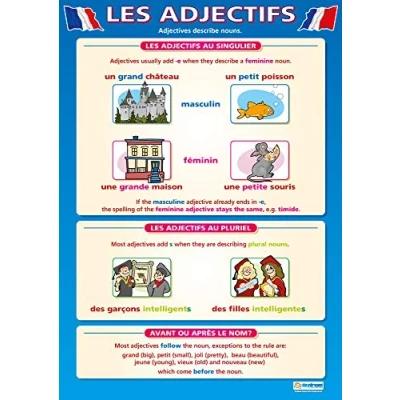 EDUCATIONAL CHART DESIGNED BY TEACHERS: Our Les Adjectifs poster helps students to learn, engage and remember more information than ever before. Covering the basics of singular and plural adjectives in French, this unique school poster can play a vital role in improving both students' understanding and classroom décor. SUPPLEMENT KNOWLEDGE: Our educational school posters are colourful, beautifully illustrated and contain a huge amount of valuable information. The Modern Languages poster is specifically designed to help students gain a greater understanding of singular and plural adjectives in French. The wall chart is a great resource for Schools, Classrooms, Language Teachers, Students, Tutors, Home School Parents and Home School Kids. MAKE LEARNING FUN: Engaging, clear and colourful designs and images create a fun learning environment in which students can excel. Our amazing wall posters can help to increase students’ interest towards Modern Languages, while recapping any key information they've been taught. LARGE SIZE – IDEAL FOR READING FROM A DISTANCE: Our school wall charts are a generous size, measuring 850mm x 594mm (A1). This ensures all posters are easily readable from a distance. Our educational posters are a fantastic way of brightening and decorating any classroom and can easily complement every type of learning environment. THE UK’s NO. 1 PROVIDER: Brought to you by Daydream Education, the UK's leading provider of educational posters for schools, with a range that spans over 25 subjects across key stages 1 – 5. By combining a bold, visual approach with simple, concise information, we have provided over five million resources to more than 50,000 classrooms worldwide.