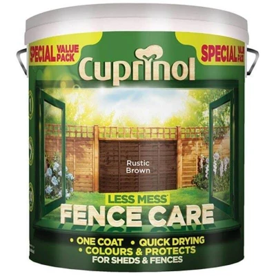 General description Cuprinol Less Mess Fence Care in Rustic Brown is specially formulated to color and protect rough sawn timber. The new formulation makes it easier to apply, ensuring rich color and even coverage in just one coat. Technical specifications Size: 6 Litre Colour: Rustic Brown Quick-drying Low odour Usage It is safe to use around plants and pets.