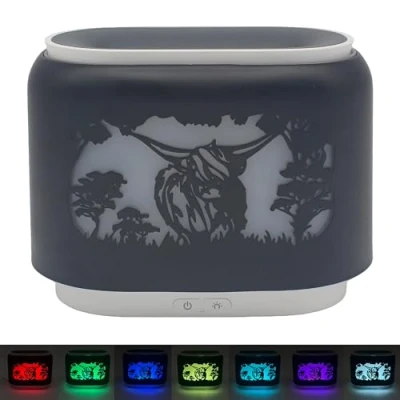 STYLISH HIGHLAND COW DESIGN: Add charm to your home with this Highland Cow aroma humidifier, delivering soft cool mist while decorating your bedroom, nursery, or living space with a fun and relaxing design. QUIET AND RELIABLE OPERATION: Designed as a quiet bedroom humidifier, it provides smooth mist output to help ease dryness, cough, and congestion—ideal for nighttime use in bedrooms, baby rooms, or home offices. IMPROVES AIR QUALITY: This cool mist air humidifier helps balance room humidity, reduce dryness, and support breathing comfort, making it perfect for bedrooms, living rooms, and small indoor spaces. AROMATHERAPY FUNCTION: Add your favourite essential oils to enjoy calming fragrance and refreshing mist; works as both a room humidifier and aroma diffuser to support relaxation and stress relief. COMPACT AND PORTABLE: A mini humidifier that fits perfectly on bedside tables, desks, and shelves—ideal for small rooms, apartments, dorms, and home humidification all year round.