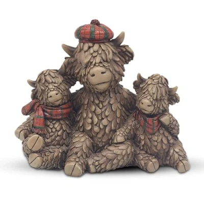Lesser & Pavey Hughie Highland Cow Family Bronze Effect Ornament with Cute Tartan Hat and Scarf Accessories House Decoration or Gift