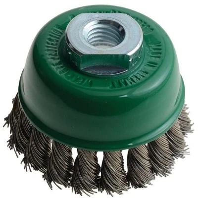 General description This Stainless Steel Wire Mesh Broom, Model 482817 by Leßmann, features a smooth, braided design embedded in a robust steel body. It is engineered for heavy-duty cleaning and surface preparation tasks, offering highly aggressive brushing power and excellent wear resistance. Technical specifications Brush type: braided wire Material: steel Maximum rotational speed: 12,500 rpm Useful length: 20 mm Diameter: 65 mm Thread size: M14 internal threading Wire gauge: 0.50 Wire type: stainless steel Compatibility and accessories Compatible with angle grinders with M14 threaded spindle Installation Install the brush onto the angle grinder's M14 spindle, ensuring it is securely tightened before use. Usage Use for aggressive cleaning, rust removal, and surface preparation on metal surfaces. Operate at a maximum of 12,500 rpm for safety and optimal performance. Other information