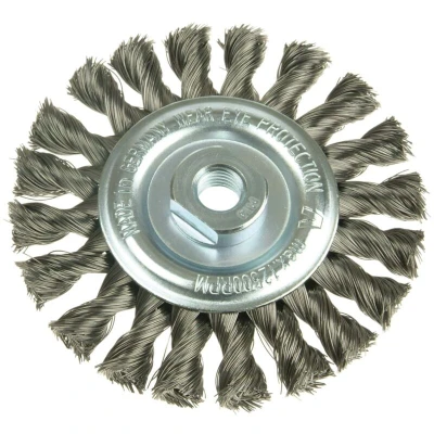 General description This Lessmann Knot Wheel Brush is designed for use with grinders, angle grinders, and stationary machines. It is ideal for preparing and reworking bolt fillet and butt welds, effectively removing scale, rust, paint, slag, and rubber residue. This brush can also be used for deburring tasks and is made with high tensile strength steel wire to meet demanding performance requirements. Technical specifications Diameter: 100mm Width: 12mm Bore: M14 Wire gauge: 0.50 Wire type: Steel Maximum RPM: 12,500/min Compatibility and accessories Compatible with angle grinders and stationary machines Suitable for various surface preparation and cleaning tasks Installation Ensure the machine is turned off and unplugged before installation Attach the brush securely to the grinder or machine's arbor, ensuring it is properly centered and tightened Usage Use at appropriate RPM to avoid overloading or damaging the brush Wear protective gear such as gloves, goggles, and masks during