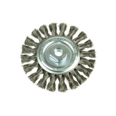 General description Lessmann Round Wire Brushes are designed for use with angle grinders and stationary machines. These twisted steel wire circular brushes are ideal for preparing surfaces and post-treatment of welds by effectively removing scale, rust, paint, slag, and rubber residues. The brushes feature left-twisted tufts that minimize opening during use, extending their lifespan. To maintain optimal cutting performance, it is recommended to rotate the brush during operation to keep the tufts sharp. Technical specifications Material: Steel wire Twist: Left-twisted Thread size: M14 Maximum rotational speed: 12,500 RPM Tuft thickness: 0.5 mm Tuft height: 24 mm Brush diameter: 115 mm Number of tufts: 20 Brush width: 14 mm Compatibility and accessories Compatible with angle grinders and stationary machines Suitable for surface preparation and cleaning tasks Installation Ensure the grinder or machine is turned off and unplugged before installation Thread the brush onto the compatible
