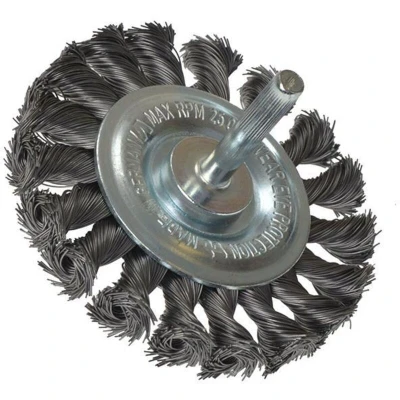 General description This knotted wheel brush is designed for heavy-duty cleaning and surface preparation. It is ideal for removing rust, scale, paint, and debris, as well as deburring and roughening surfaces. The brush features tightly packed steel wires that provide effective cleaning power and a long service life. Technical specifications Wire Type: Steel Wire Gauge: 0.35 mm Diameter: 75 mm Width: 12 mm Shank Diameter: 6 mm Maximum Speed: 20,000 rpm Compatibility and accessories Compatible with standard rotary tools and angle grinders with a 6 mm shank Installation Insert the shank into the compatible rotary tool or grinder Ensure the tool is turned off before installation Tighten securely to prevent slipping during use Usage Use in a controlled manner to remove rust, paint, or debris from surfaces Operate at recommended maximum speed for optimal performance Wear appropriate safety gear, such as gloves and eye protection Other information Designed for durability with a long service