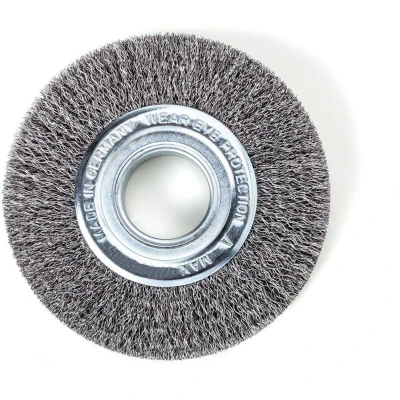 General description LessMann Circular Steel Wire Brush is designed for effective surface treatment applications. These circular wire brushes feature wavy steel wire, making them ideal for removing rust, paint, dirt, and insulation layers, as well as for deburring and polishing surfaces. Technical specifications Type: Circular wire brush Wire material: Steel, wavy/undulated Diameter: 125mm Width: 20-22mm Min/Max Bore: 13/40mm Wire Gauge: 0.30/0.35 Max R.P.M: 6,000 Compatibility and accessories Designed for use with stationary machines. Includes plastic reducers and adapters for different shaft sizes: 16mm 20mm 22mm 32mm 1/2 inch 1 inch Installation Attach the brush to compatible stationary machines using the appropriate reducer or adapter. Ensure the brush is securely mounted before operation. Usage Use for light to moderate cleaning tasks on large surface areas. Ideal for deburring, removing rust, paint, and scale from surfaces. Other information