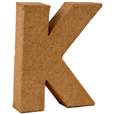 Papier Mache Letter K Our own-brand range of biodegradable low-cost papier mache shapes (made from recycled waste products e.g. old newspapers cardboard etc) have been hand-made using 100% recycled materials and organic glue. The designs are supplied in a buff or manila colour ready to paint or decorate with acrylics inks poster paints stamps polymer clay foam clay decoupage (or Decopatch) papers napkins glitters embelishments beads fabric and much more. Dimensions: 10cm - 4 Sold in PACKS OF 5 We also supply 20.5cm medium letters under product code CLP2001 to CLP2026 in packs of 3 and have had them made as 3D boxes in packs of 3 under product codes CLP2301 to CL2326. CLP2111 MPN ED3282/10/K