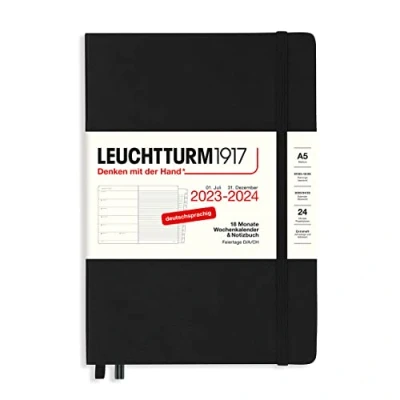 LEUCHTTURM1917 367689 Weekly Planner & Notebook Medium (A5) 2024, with booklet, 18 Months, Black, German